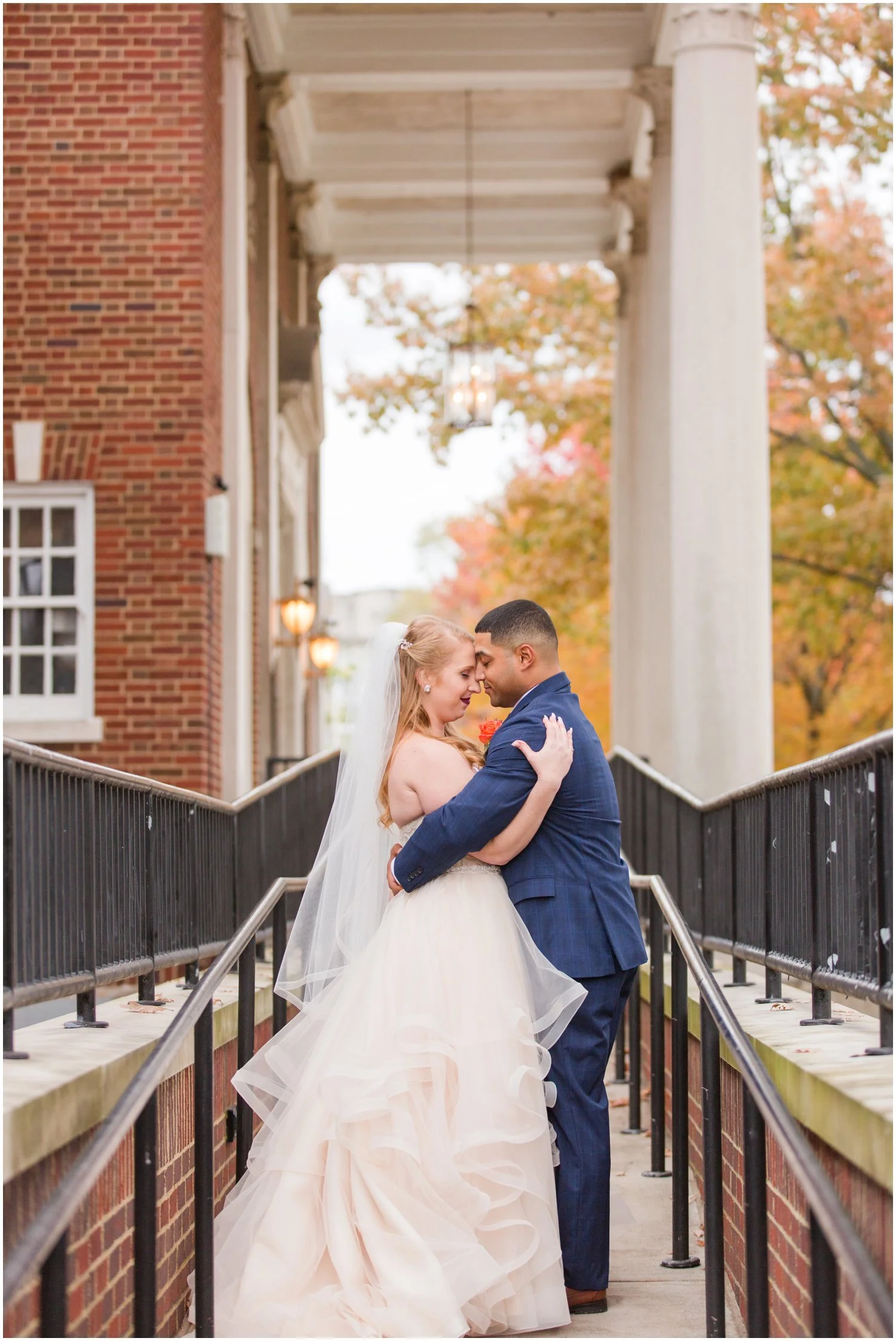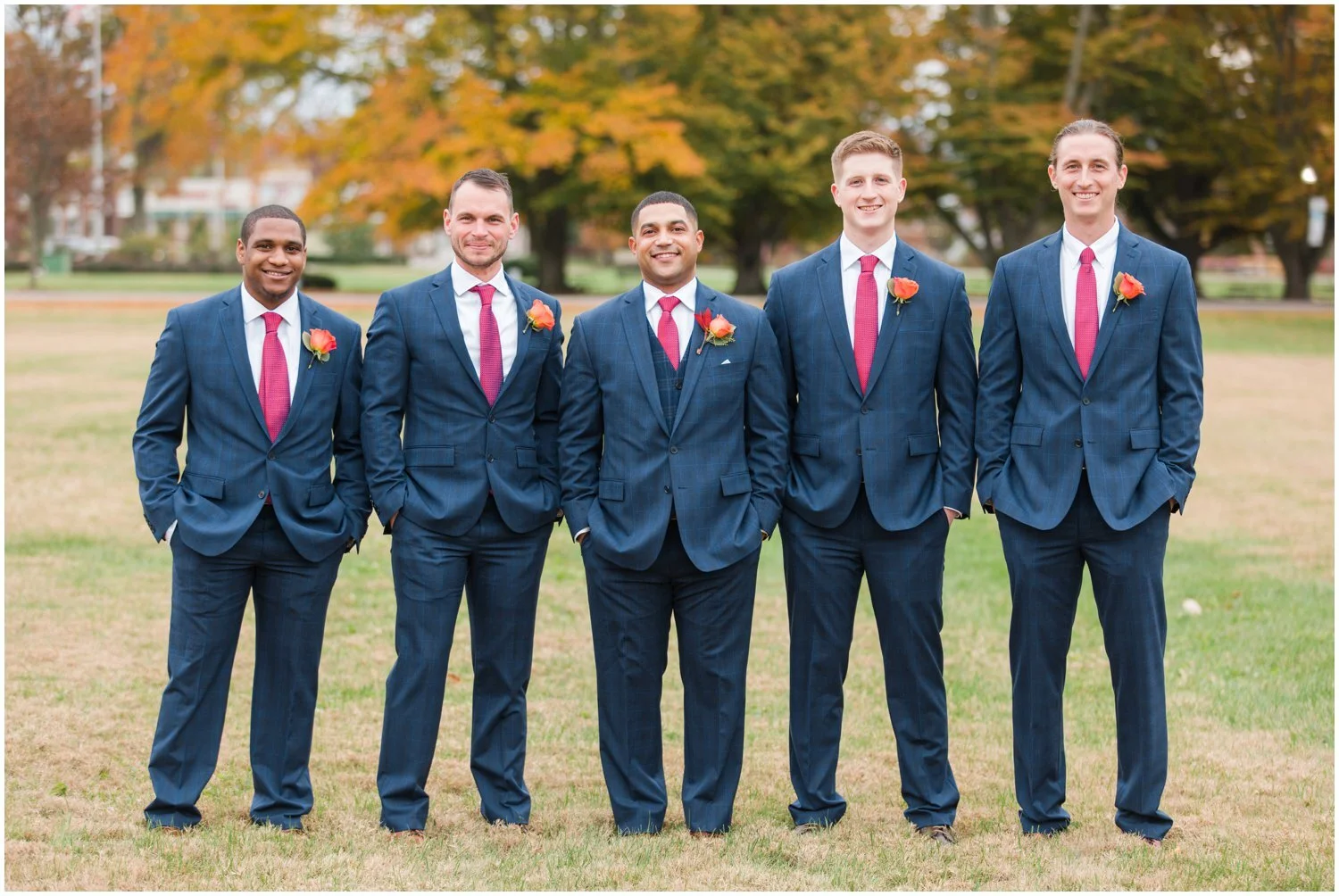 From the bride: Our wedding was as fun as the fall colors were bright!! Surrounded by beautiful autumn leaves, we shared a very intimate first look (groom’s favorite part) and read our personal vowels to each other. We then shared a first look with our puppies, Louis and Clark (bride’s favorite part), before the ceremony. We did a knot tying ceremony in lieu of a sand pouring, and tied a braid to complete a cross, that was mounted on an intricate wooden piece made by my uncle. After officially becoming Mr. and Mrs. Barnett, we had a delicious station buffet dinner, filled with all our favorite foods! I’m talking beef and chicken sliders, french fries, tacos, chips and queso and more. We then had a soft pretzel station later on in the night as a fun treat. Our cake was three “naked” layers of three different flavored cakes and frostings and the groom’s cake was a donut tower. Surrounded by friends and family we shared our first dance to Forever Mine by The O’Jays. Our guests all had photo booth photos and dog treat bags to go, courtesy of our pups. We ended the night with a sprinkler send off and rode away from the most magical night of our lives as happy, thankful, and blessed newlyweds.