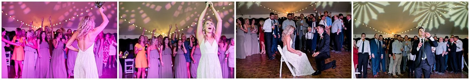 From the Bride: Our wedding details are quite different than your typical southern wedding. While we did have elegant decor with black table cloths on round tables and flowers and candles lit everywhere, we added a twist of boho and classic feel with our non-traditional seating, throws, and pillows to decorate the outdoor area around my parent's barn where the reception was held. One of my favorite details of the day was a collage of enlarged black and white pictures on one of the barn walls. Each of these photos had our parents and grandparents past wedding day's captured on them and it was so special for our family to see this. Another favorite detail of the day was my bouquet- my coordinators not only coordinated the wedding, but put together our amazing flower arrangements as well! And a very sentimental detail of the day were the earrings that I wore. They were the earrings that my mother wore on her wedding day, and it was so special to be able to wear them on my big day as my "something old". A random fun fact about a chandelier at our wedding: my mom actually purchased this from Free People when they were cleaning out their store one summer day, and it turned out to be a really fun detail that went perfect with the vibe of the evening!