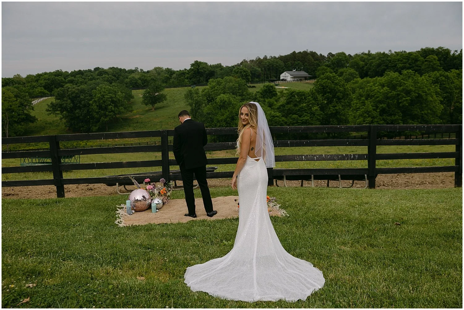 From the Bride: Our wedding was at a private venue that has never been used! Kentucky Hills Wagyu- there were cows mooing the whole time! Our wedding was a perfect mix between Kentucky country, and 70’s disco. The highlight was our entrance on a baby blue Mercedes and the disco ball installation inside the barn. We danced our first dance to “Fade Into You” by Mazzy Star. It was the most perfect Kentucky spring night!